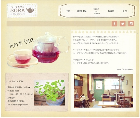 美味しいハーブティーとハーブを使ったお料理を提供するカフェのサイト。Natural志向に合わせて、使用する素材もナチュラルなものを使用しています。上はトップページ、下はハーブティーメニューです。