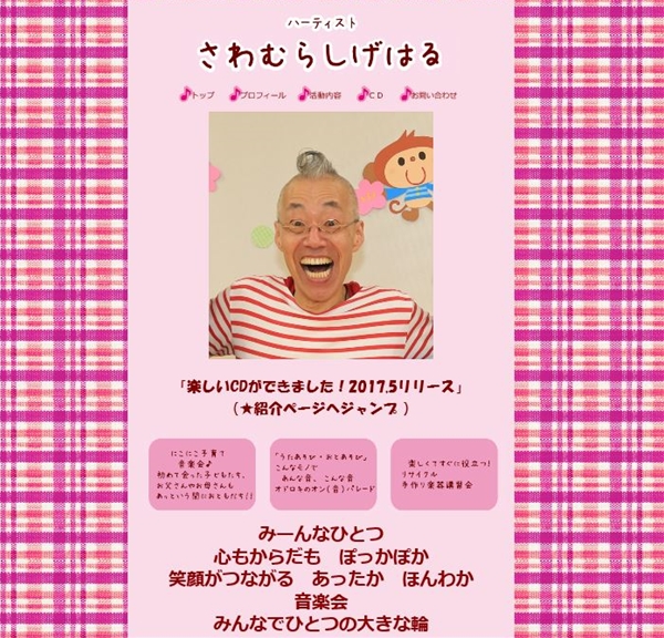 関西圏などで活動されている『ハーティスト(ハートフルアーティスト) さわむらしげはる』おっちゃんのHP。日常の身の回りにあるものを楽器に変身させ、こどもさんをわいわいきゃっきゃと喜ばせてしまうコンサートを行うおじさんです。元気カラーでのHTML/CSSコーディングしました。